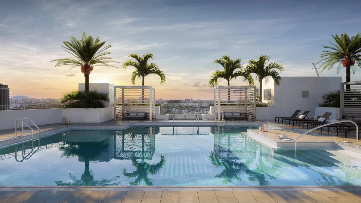 Amenities include a 24/7 fitness center and rooftop pool.